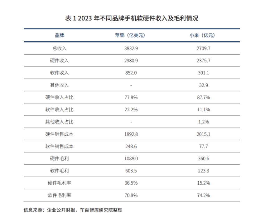 软件及其衍生增值服务将构建持久的用户参与模式,改变汽车行业盈利结构-重心从单纯的整车销售向软件服务与互联网增值服务扩展,有望成为企业利润的主要来源之一。汽车行业硬件成本高,软件及其增值服务的利润虽然无法达到智能手机的占比,但也有望扭转行业利润率持续下滑的局面。参考苹果公司,2023年其软件及服务营收852亿美元,占总营收接近22.2%,但是毛利贡献达35.5%,核心原因就是软件毛利率超过70%。
