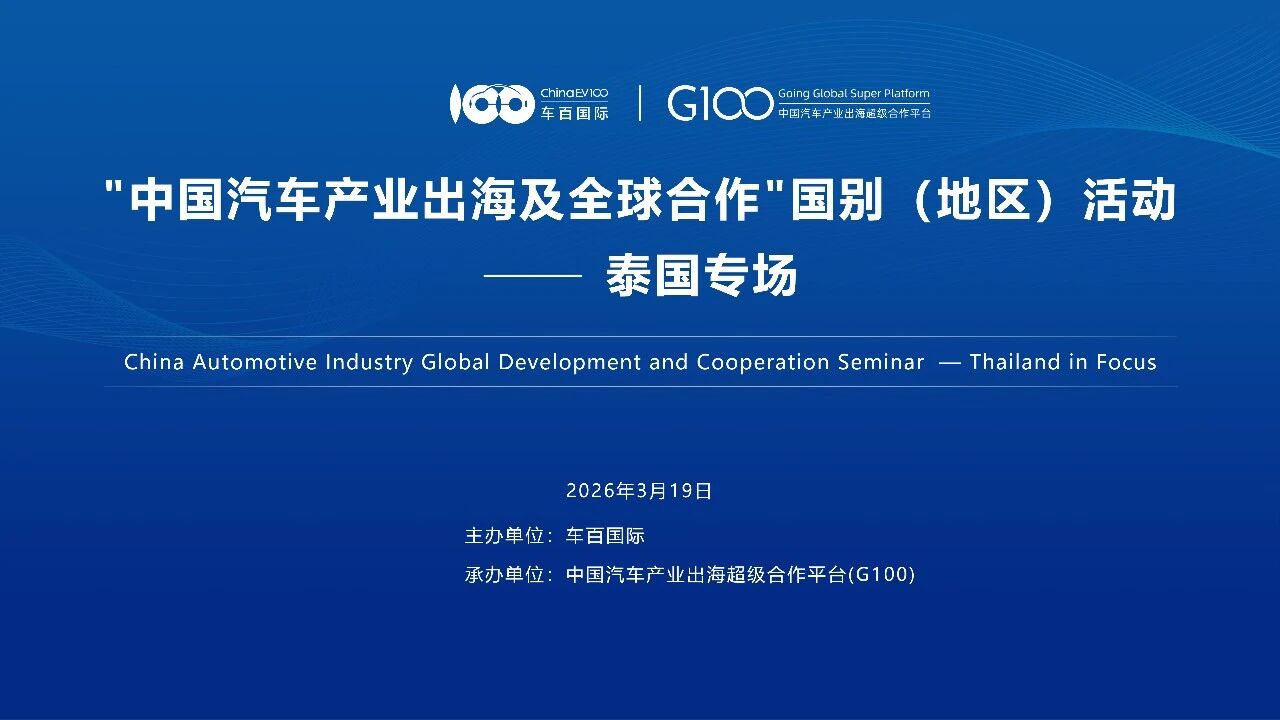 基于此,由车百国际主办,中国汽车产业出海超级合作平台(G100)承办的“中国汽车产业出海及全球合作”国别(地区)活动---泰国专场,将以探索中泰新能源汽车产业合作发展新模式为主题,于2026年3月19日在上海举办,搭建中国汽车产业与泰国市场的交流对接、资源整合、合作共赢平台,助力企业把握泰国市场机遇,破解出海难题,实现本土化深耕与区域化拓展。